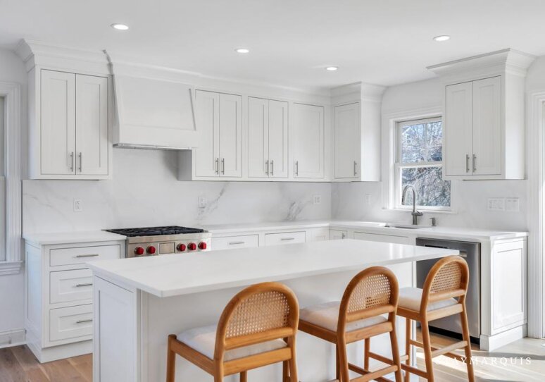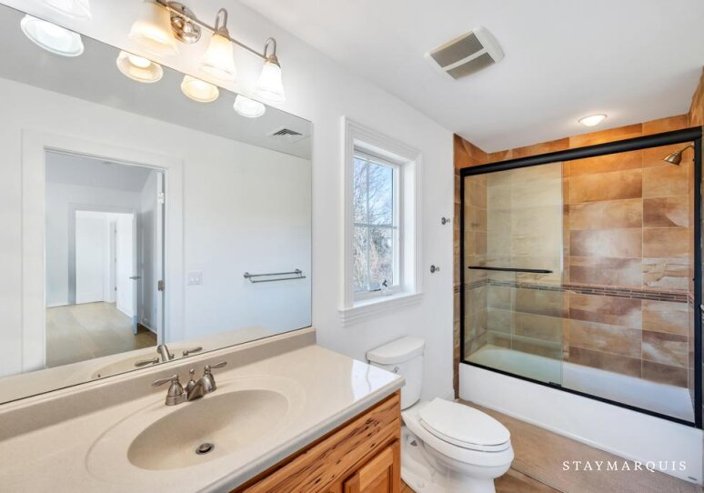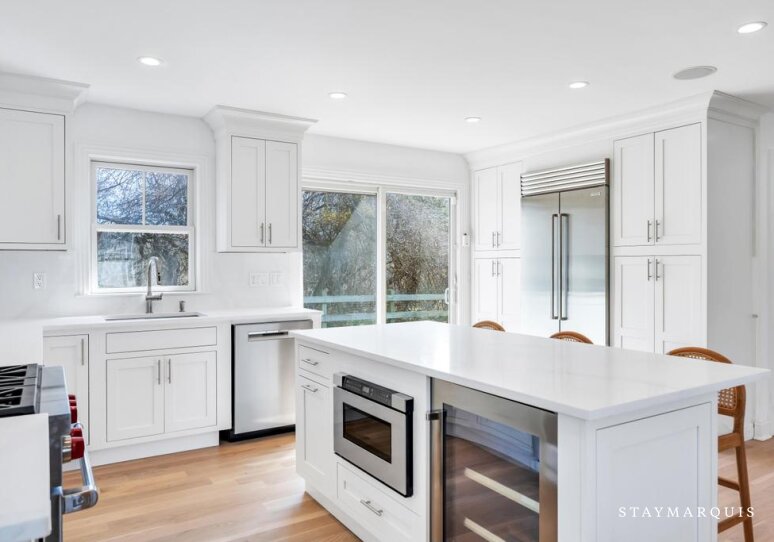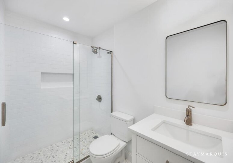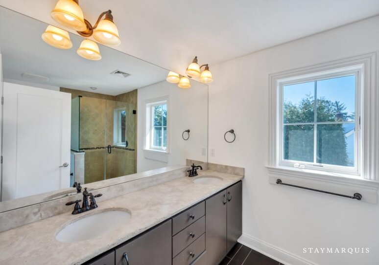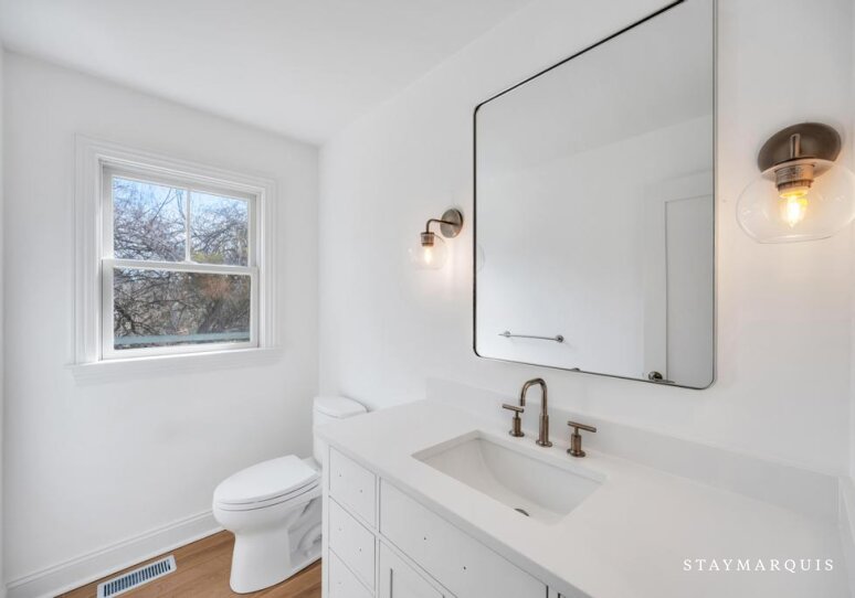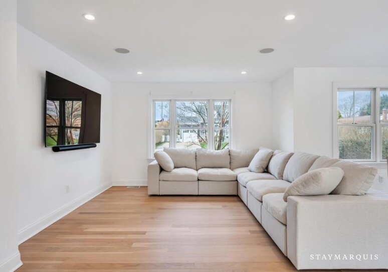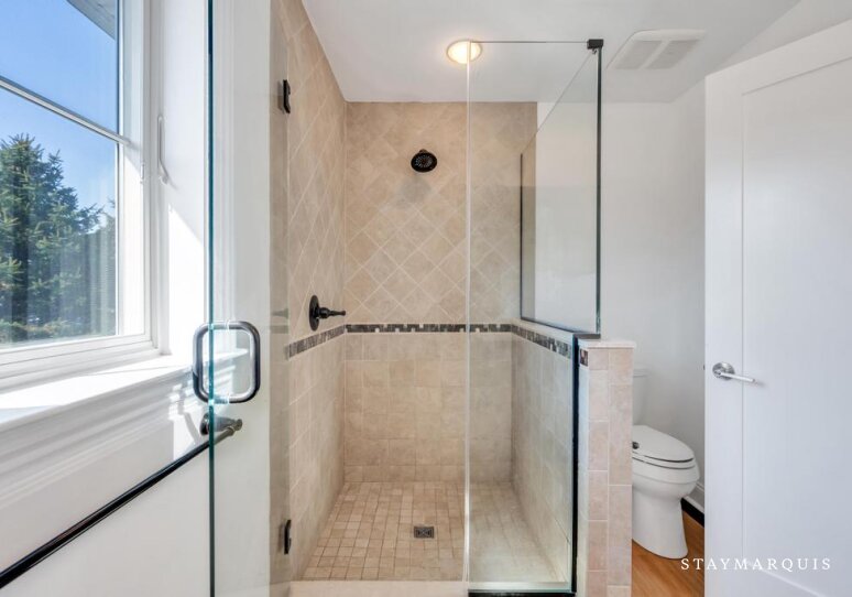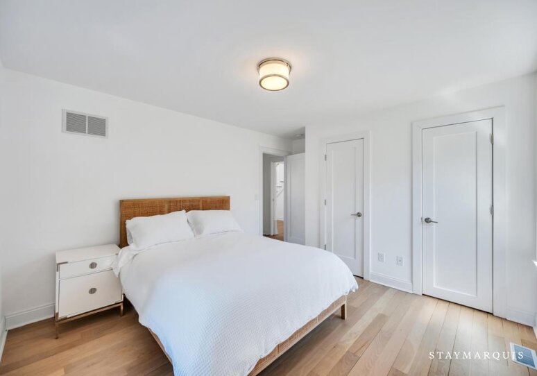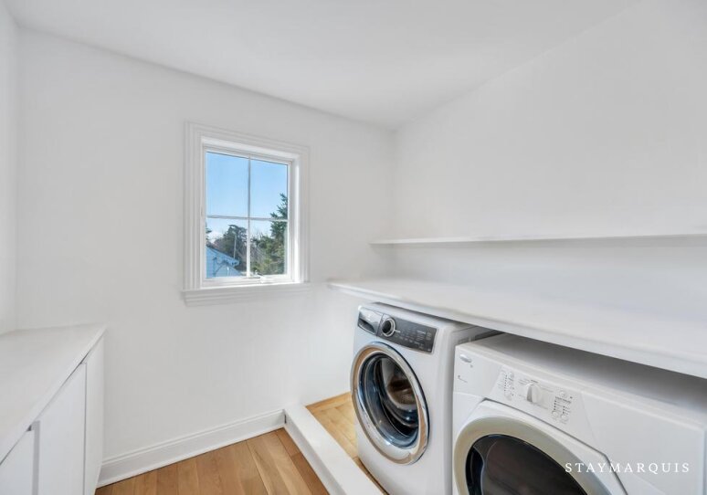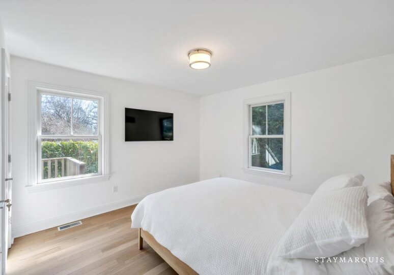 When it’s time to retreat, the home’s four bedrooms promise rest and restoration. Each room has been designed with a light, bright, and calming aesthetic. The primary suite, located on the second floor, offers a spacious king bed, complemented by a charming bay window with a sitting area that invites quiet moments of reading or reflection. The ensuite bathroom is spa-like in every sense, with a rain shower that turns a daily ritual into a luxury. Also upstairs is a beautifully appointed guest suite with a queen bed and its own private ensuite bathroom. On the main floor, two additional bedrooms—each featuring a queen bed—share a hall bathroom, making them ideal for guests or family members. A powder room on the main level adds an extra touch of convenience. Fresh linens, plush towels, and thoughtful details ensure every guest feels cared for and at home.