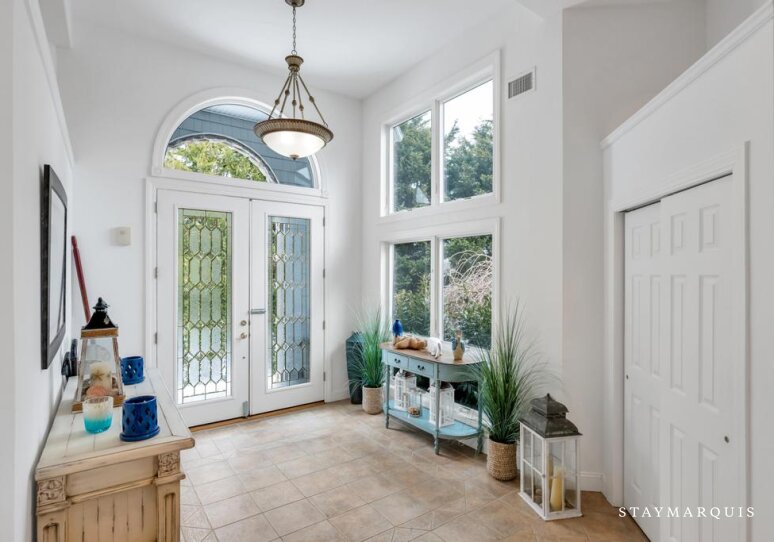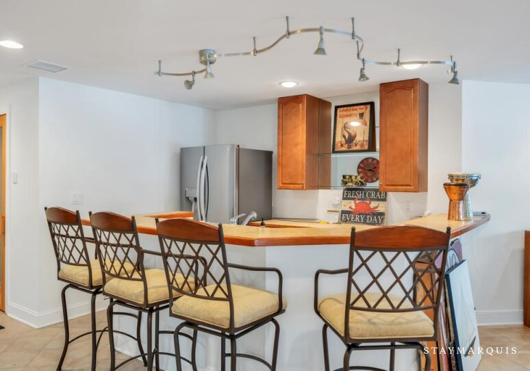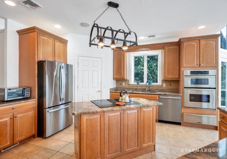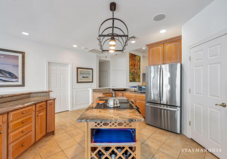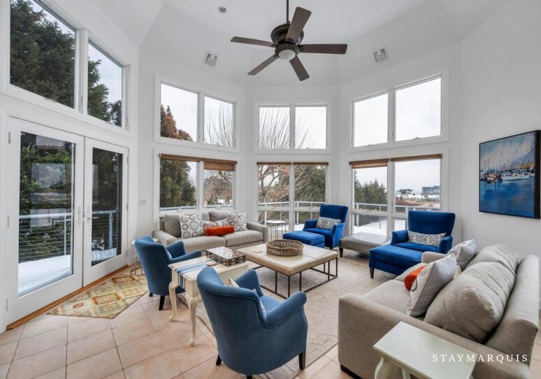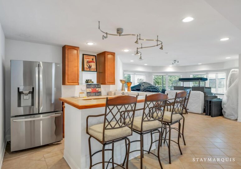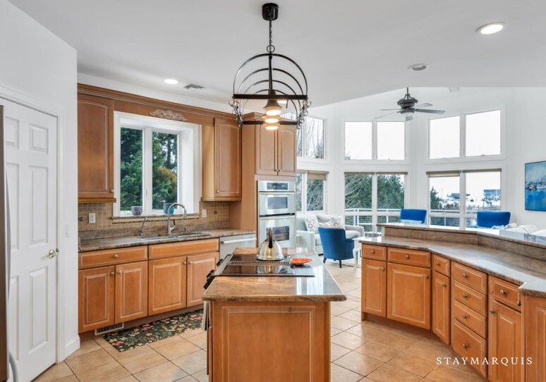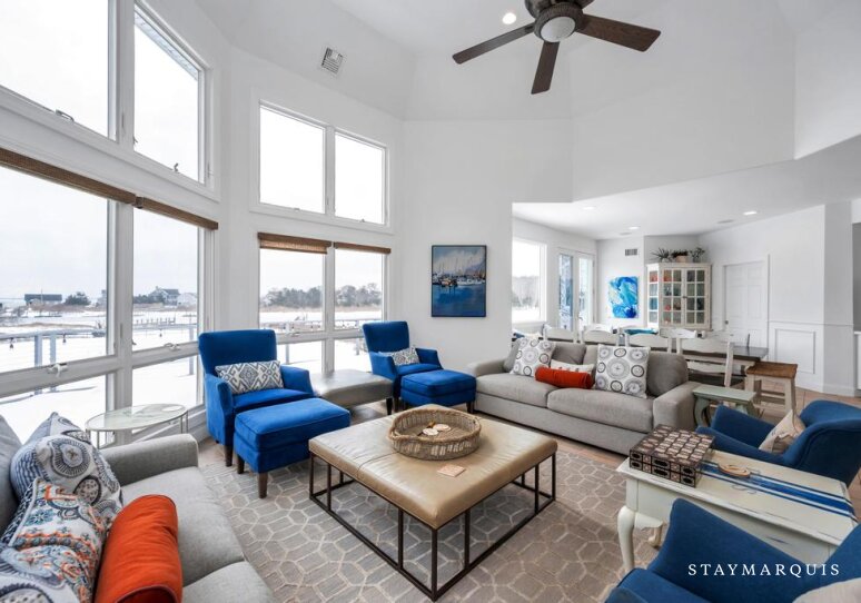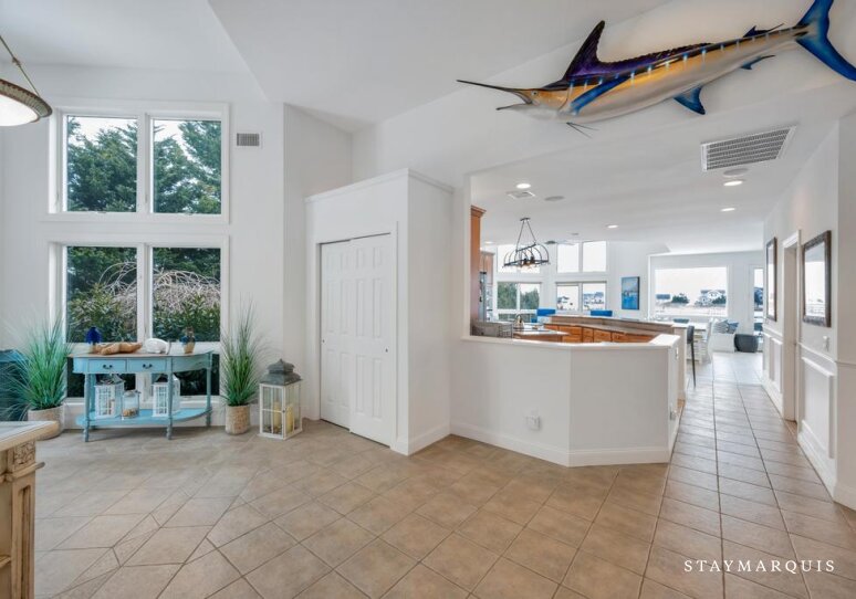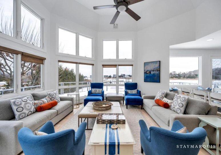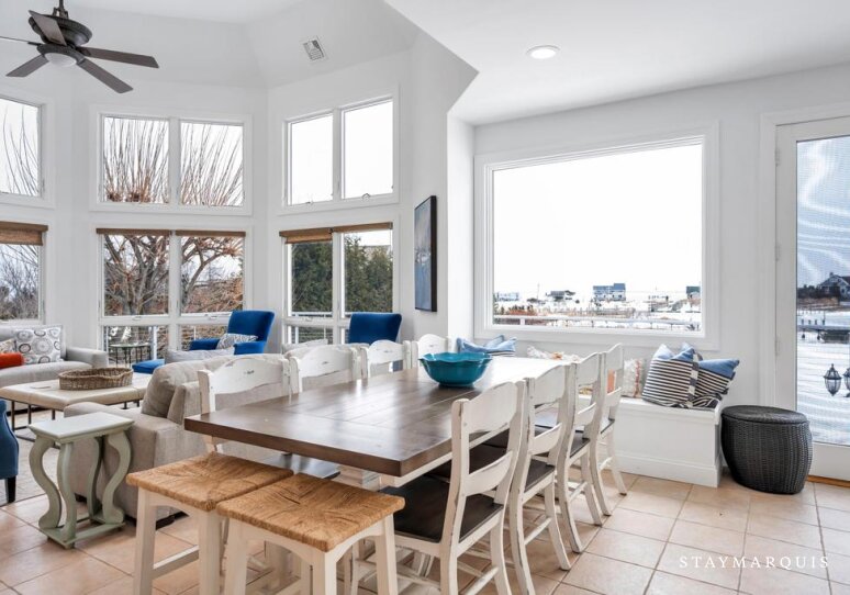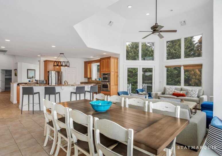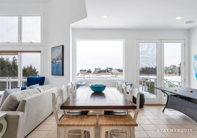Inside, the home opens into bright, light-filled living spaces where modern design and comfort come together seamlessly. Large windows frame sweeping water views and allow natural light to pour in throughout the day, enhancing the home’s airy, welcoming atmosphere. The open layout flows easily from the living room to the dining area and into the gourmet kitchen, creating an ideal environment for shared meals, conversation, and connection. The kitchen is beautifully equipped with top-of-the-line appliances, generous counter space, and everything needed to prepare meals for a crowd or intimate dinners alike. A coffee maker sets the tone for slow mornings, while high-speed WiFi supports streaming, entertainment, and remote work. Central air conditioning ensures comfort year-round, and a washer and dryer add everyday convenience for longer stays.