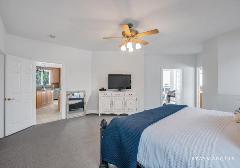 - Bedroom 1: One King Bed, First Floor/Main Floor, Air Conditioning, Ensuite Bathroom, TV, Closet