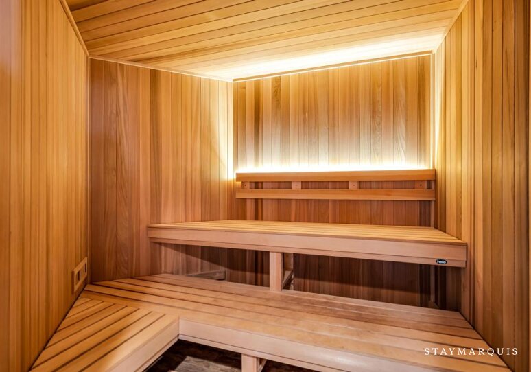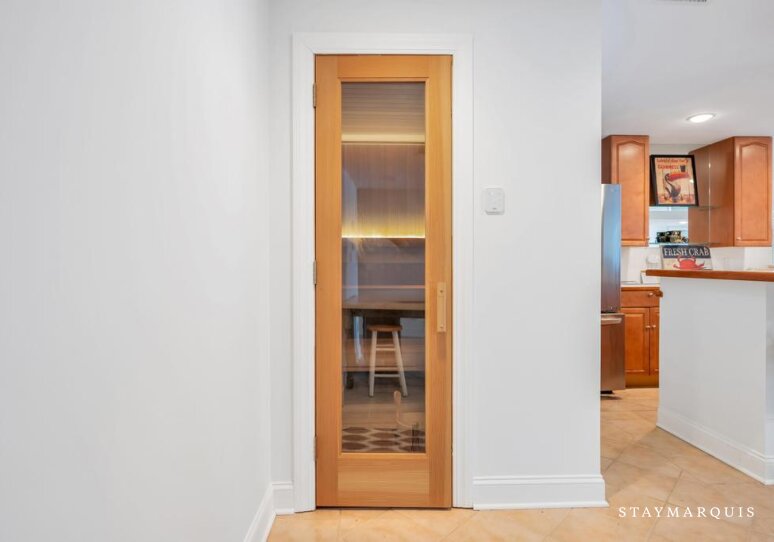 Bed Linens, Air Conditioning, Dryer, Heating, Internet (Wifi), Washer, Garage (Detached, Available for renter cars), Hair Dryer, Iron/Ironing Board, Living Room, Parking, Bath Towels, Pool/Beach Towels, Microwave, Coffee (Pot), Dishes and Silverware, Pots and Pans, Toaster, Blender, Ping Pong Table, Television (Main Living Room, Den, Office, Media Room), Sauna, Pack 'n Play/Travel Crib, Kitchen, Carbon Monoxide Detector, Smoke Detector, Hot Water, Refrigerator, Oven, Stove, Dishwasher, Fire Extinguisher, Essentials, Smart TV, Wine Fridge, Ice Maker, Privacy (Completely Private), Private Entrance