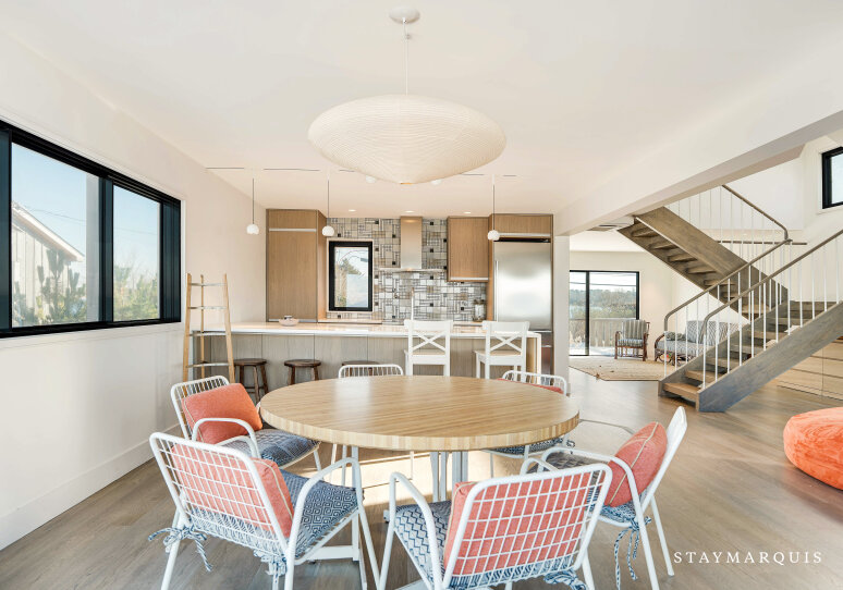 Stepping inside, guests are greeted by an abundance of natural light and a seamless open layout that flows effortlessly from one room to the next. The living room offers a warm and comfortable space for relaxing, complete with soft seating and a welcoming design aesthetic. From there, the space transitions into the dining area and the gourmet kitchen, where top-of-the-line appliances, ample counter space, and a coffee maker await both casual cooks and culinary enthusiasts. The thoughtful layout encourages conversation and connection, making it easy for everyone to gather together. Modern conveniences such as high-speed WiFi, central air conditioning, and a washer and dryer ensure that guests have everything they need for a comfortable and carefree stay. The home’s design balances modern luxury with an inviting atmosphere, creating a setting where guests instantly feel at ease.
