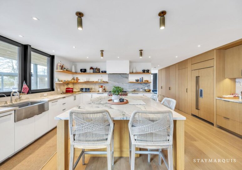 Inside, the home is designed for both comfort and style, with open living spaces filled with natural light. The great room features a striking wood-burning fireplace, adding warmth and ambiance during cooler evenings. The gourmet island kitchen is both elegant and functional, equipped with top-of-the-line appliances, generous counter space, and a Nespresso coffee maker that makes mornings feel indulgent and unhurried. The kitchen flows seamlessly into the dining and living areas, creating a natural gathering place for shared meals and conversation. Modern conveniences include high-speed WiFi, central air conditioning, and a washer and dryer. A dedicated work-from-home space allows guests to stay connected when needed, while a fully equipped gym supports wellness routines throughout the stay.