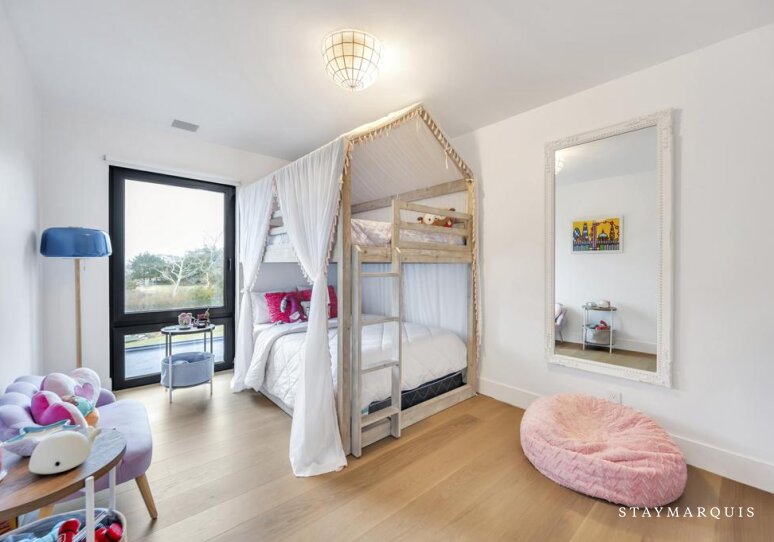 The bedrooms are thoughtfully arranged to offer privacy, comfort, and flexibility for groups of all sizes. Each bedroom is outfitted with fresh linens and all the essentials needed for a restful stay. The home features a mix of king and queen bedrooms, along with a bunk room with double full beds—ideal for children, teens, or friends traveling together. The bathrooms are spacious and well-appointed, offering a calm, spa-like feel that complements the home’s modern yet inviting design.