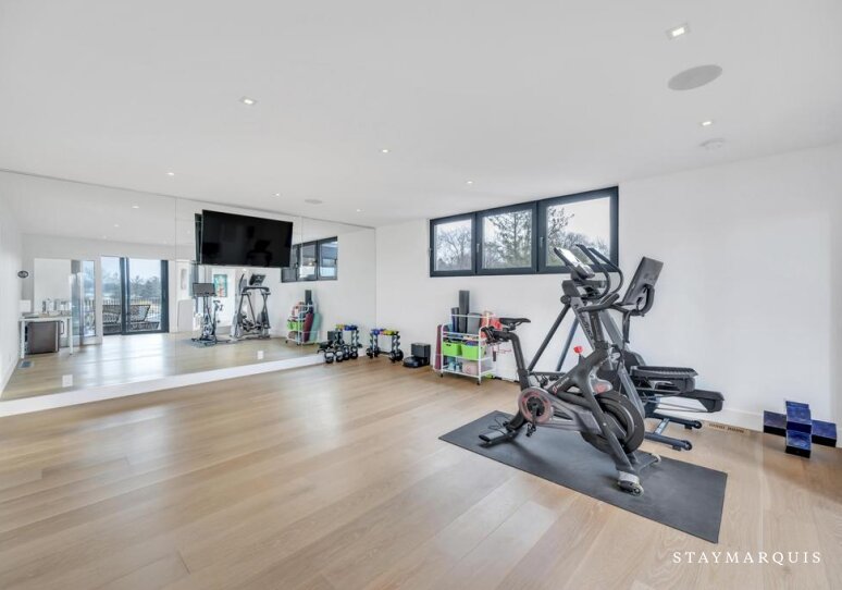Bed Linens, Usable Fireplace (Wood), Air Conditioning (Central Air), Dryer, Heating, Internet (Wifi), Washer, Gym/Fitness Room (Stationary Bike, Weight Training Equipment, Stretching / Yoga Mat), Garage (Attached), Hair Dryer, Iron/Ironing Board, Living Room, Parking, Bath Towels, Pool/Beach Towels, Microwave, Coffee (Pot, Nespresso, Keurig), Dishes and Silverware, Pots and Pans, Toaster, Blender, Speaker System, Television (Main Living Room, Den, Gym), Kitchen, Carbon Monoxide Detector, Smoke Detector, Hot Water, Refrigerator, Oven, Stove, Dishwasher, Electric Vehicle Charger, Fire Extinguisher, Smart TV, Wine Fridge, Ice Maker, Laptop-Friendly Workspace, Privacy (Mostly Private), Essentials