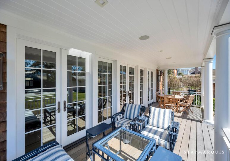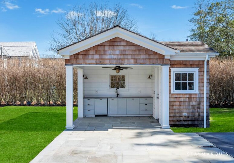 The outdoor space is equally impressive and designed to make the most of Southampton’s beautiful surroundings. The private pool sits at the heart of the backyard, framed by lush lawns and mature trees that create a sense of complete seclusion. Guests can spend long afternoons relaxing poolside, enjoying the sunshine and the gentle coastal breeze. The fenced yard offers both privacy and space, making it perfect for groups to gather and enjoy the outdoors together. A covered patio provides shaded seating and an inviting space for outdoor dining, while the gas grill makes preparing meals outside easy and enjoyable. As the sun sets, the wood-burning fire pit becomes the perfect place for evening conversations and laughter under the stars. The expansive grounds create a peaceful, resort-like atmosphere where guests can truly unwind and enjoy the beauty of the East End.