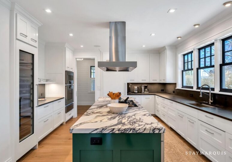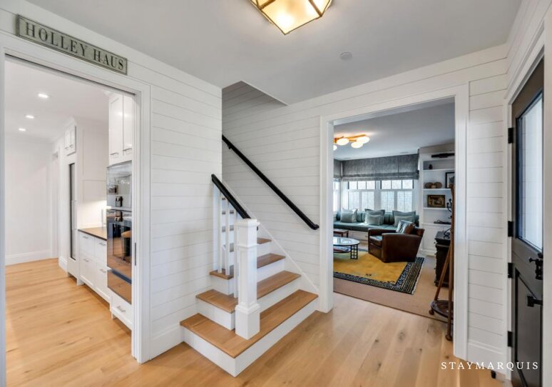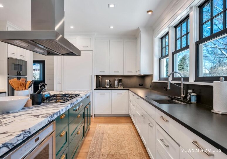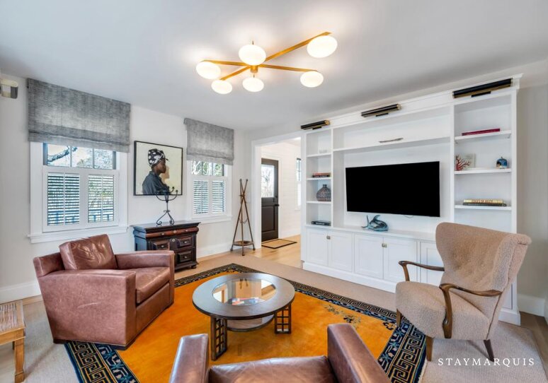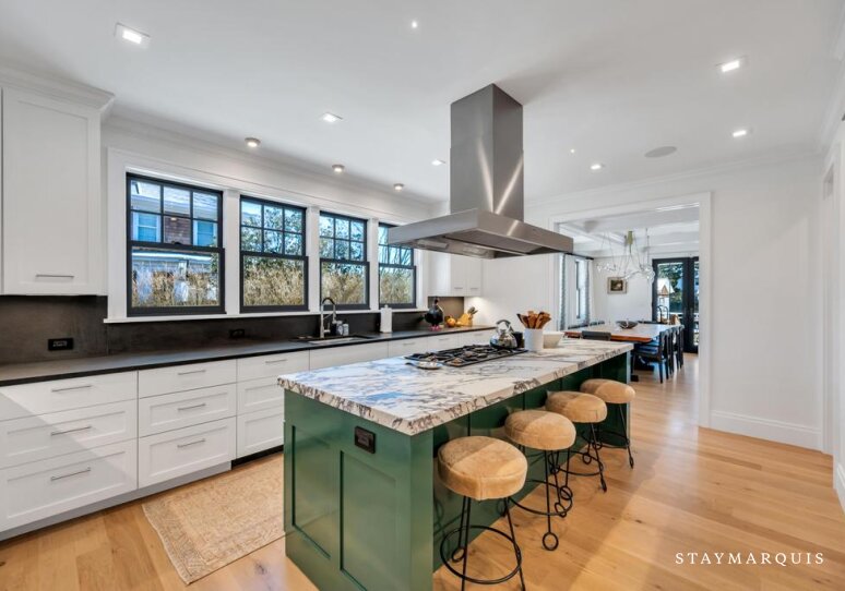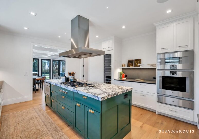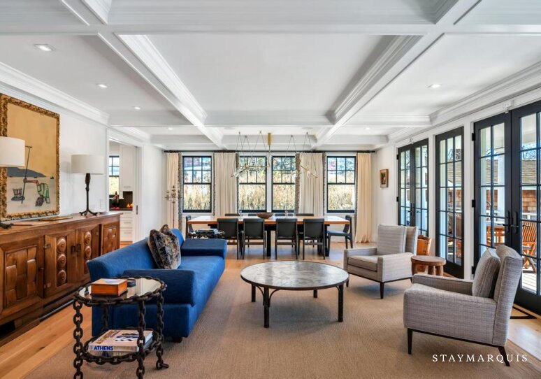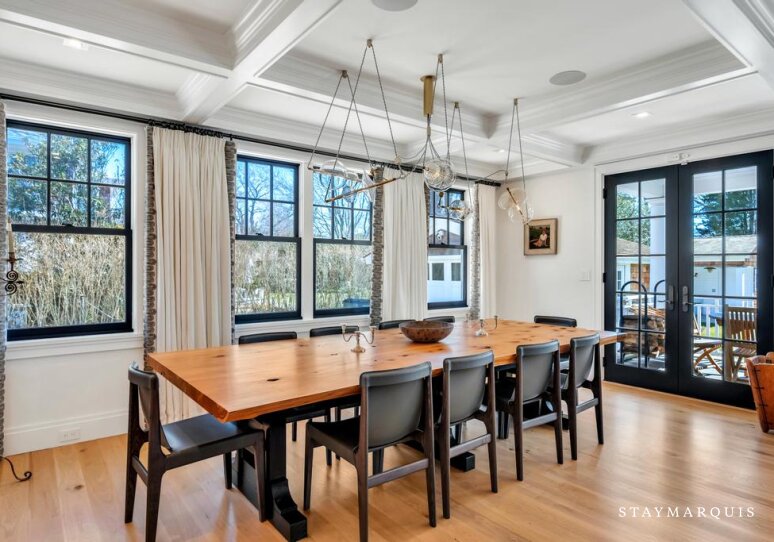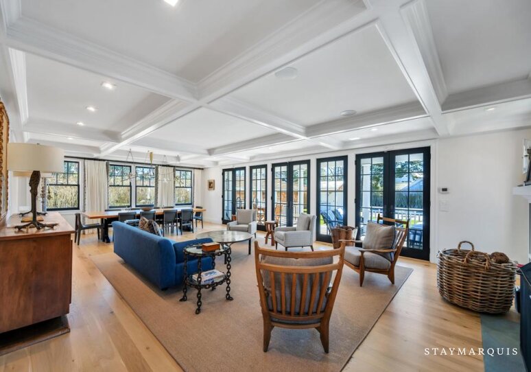 Inside, the home is filled with natural light that pours through large windows, illuminating interiors that blend timeless design with modern comfort. The open living spaces flow effortlessly from the living room to the dining area and into the gourmet kitchen, creating a seamless environment for entertaining and everyday living. The living room offers comfortable seating and a relaxed ambiance where guests can gather after a day spent exploring Southampton. Nearby, the dining area provides ample space for shared meals and celebrations. The gourmet kitchen is fully equipped with top-of-the-line appliances, generous counter space, and everything needed to prepare anything from casual breakfasts to elegant dinners. A coffee maker ensures mornings begin with the perfect cup while planning the day’s adventures. High-speed WiFi keeps guests connected when needed, and the Sonos sound system allows music to fill the home with ease. Central air conditioning maintains comfort throughout warm summer days, while the in-home washer and dryer add convenience for longer stays.