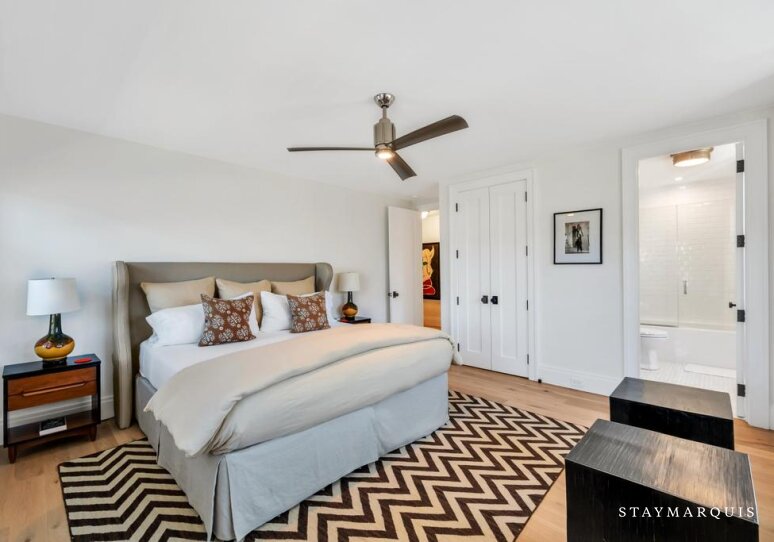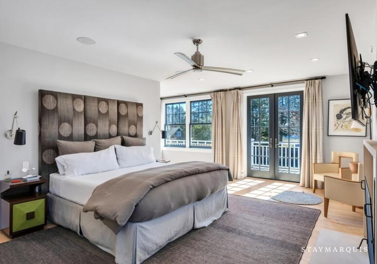 - Bedroom 1 - Primary: One King Bed, 2nd Floor, Air Conditioning, Full Ensuite Bathroom, Streaming TV, Walk-in Closet, Balcony/Deck